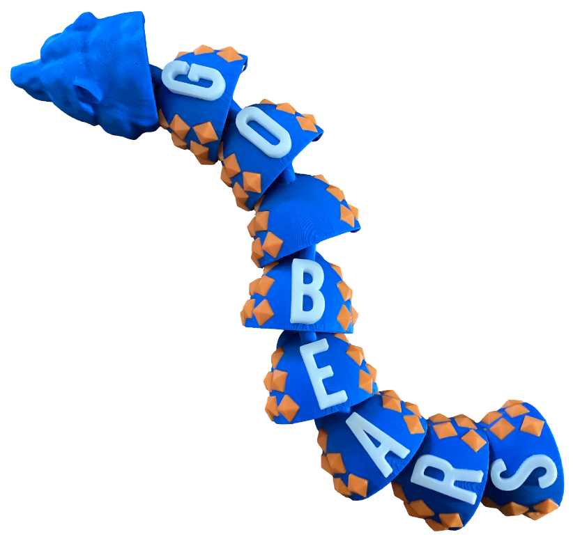 This is a 3D-printed articulated bear with moving body parts. The text on top of it says "GO BEARS".