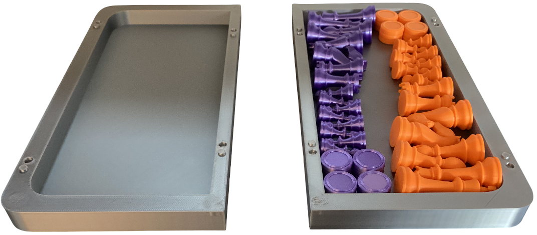 This is a 3D-printed game board that includes chess pieces and checkers pieces. The board is split into two parts, and each part has 6 magnets inside of it.